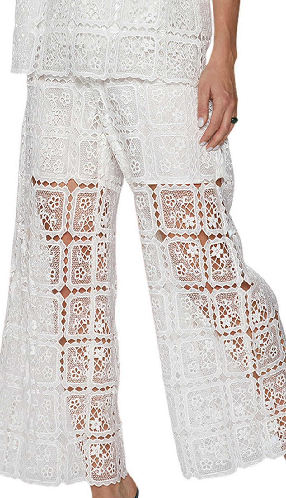 Introducing the exquisite Love the Queen 17545-P Pants, a stunning addition to your formal wear collection. These pants are the epitome of elegance and style, combining a vintage lace design with modern tailoring. The beautiful white lace fabric features intricate patterns that exude sophistication and premium fashion sense. They are designed with a comfortable wide-leg fit, ensuring ease of movement and a flattering silhouette for various body types.