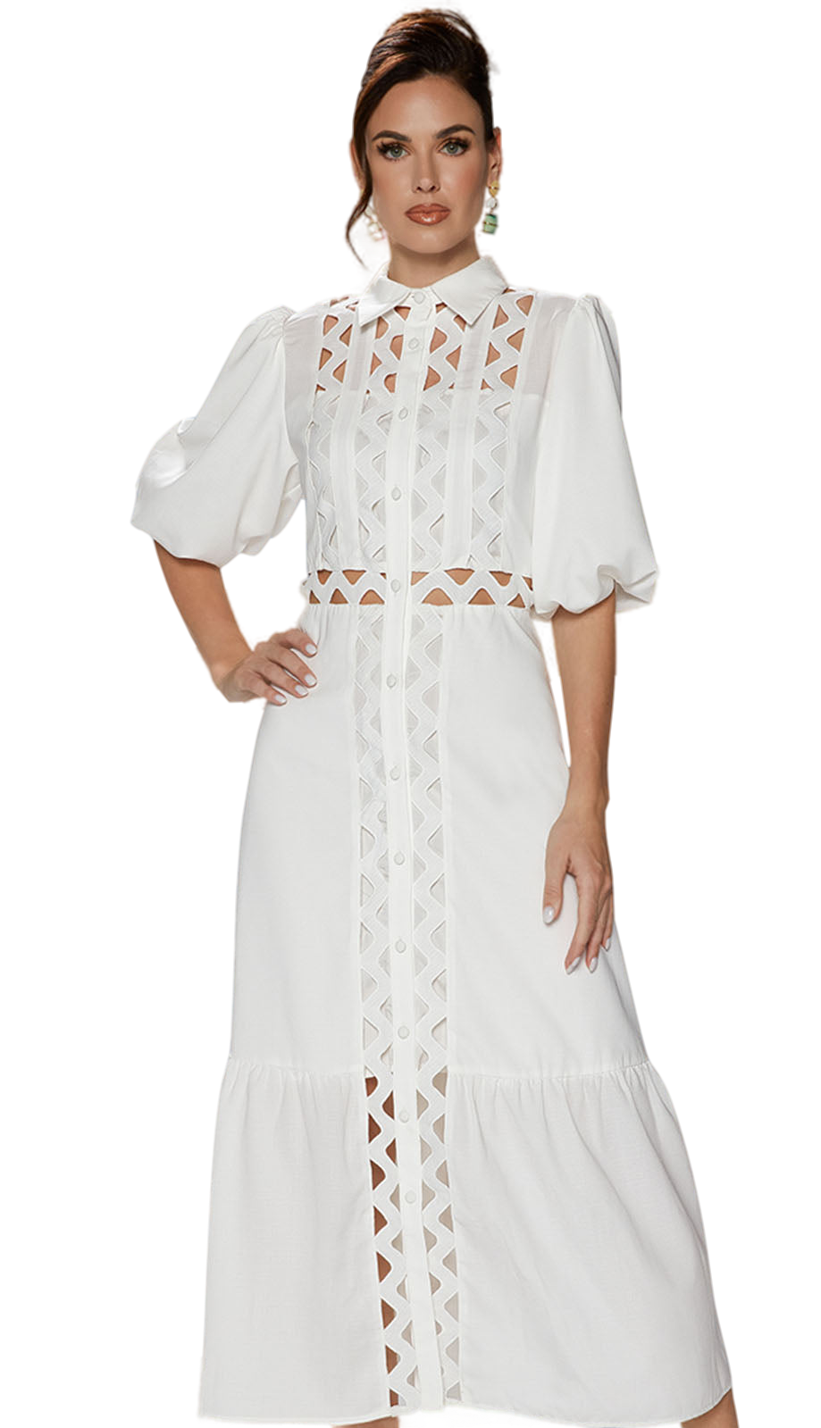 The Love the Queen 17548-WHT Dress features distinctive details that make it a must-have in your wardrobe. The puffed sleeves add a touch of dramatic flair, while the fitted cuffs maintain a demure silhouette. The centerpiece of the dress is the elaborate cut-out design that runs down the front, offering a peek-a-boo effect that adds a layer of allure without revealing too much.