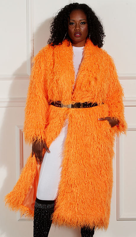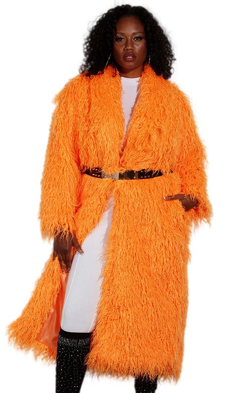 Introducing the Luxe Moda LM230 Church Coat, a garment that effortlessly combines style with comfort. This magnificent coat features a striking orange hue that is sure to turn heads and add a pop of color to any ensemble. Crafted from premium faux fur, the texture is both luxurious and eco-friendly, making it an exquisite choice for fashion-forward individuals.