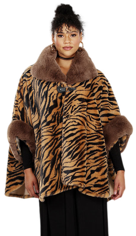 Make a wild yet sophisticated addition to your wardrobe with the Luxe Moda LM236 Cape. This eye-catching tiger print cape is designed for the fashion-forward individual who dares to stand out. The faux fur accents around the collar and cuffs add a touch of luxury and comfort that is perfect for cooler weather. The cape's cut drapes elegantly over the shoulders, making it versatile enough to complement both casual and formal attire.