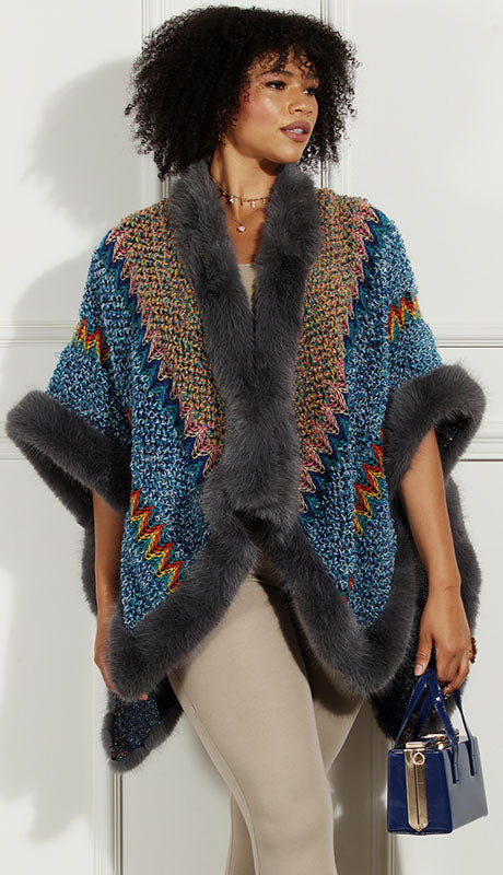 The Luxe Moda LM244 Cape stands out as a quintessential ensemble enhancer, blending a bold aesthetic with comfort and elegance. A striking zigzag pattern courses through the fabric, bringing a dynamic visual texture that's sure to turn heads. Coupled with a plush faux fur trim, this cape not only adds a touch of opulence but also provides additional warmth on brisk days.