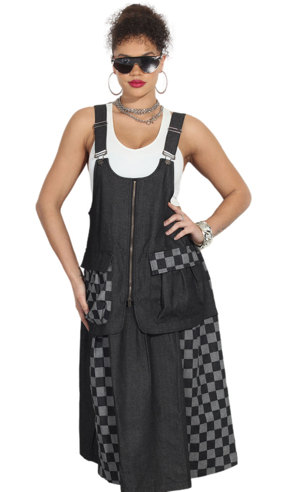 Introducing the Luxe Moda LM310-BLK Overall â a chic and versatile addition to any fashion-savvy individual's wardrobe. This overall strikes the perfect balance between comfort and style, featuring a modern wide-leg design that flatters a variety of body types. The contemporary silhouette is complemented by unique checkered pattern accents, making it a standout piece for those looking to make a statement.