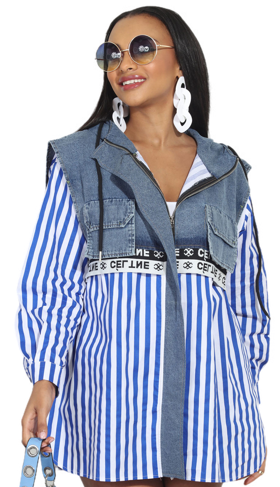 Step out in style with the Luxe Moda LM316-BWW Jacket, a fashion-forward piece that blends classic denim with a striking striped pattern to create a unique and eye-catching look. This jacket's dynamic design features a loose fit that gracefully drapes over the body, offering both comfort and versatility in your daily wardrobe. The relaxed structure makes it perfect for layering over a variety of outfits, from casual tees to chic dresses.