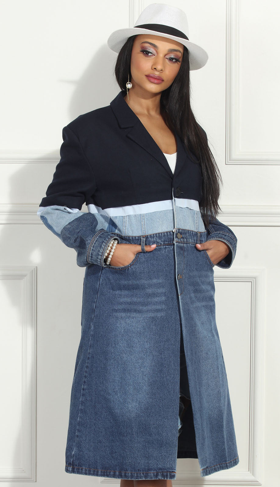 Introducing the Luxe Moda LM318-BLU Coat, a statement piece that merges timeless style with a bold, contemporary twist. This chic coat features a distinctive two-tone design with a sleek black upper that effortlessly transitions into a rich denim blue, exuding an air of sophistication and modern flair. The tailored fit is masterfully crafted to enhance your body's natural contours, ensuring you will look sharp whether you are heading to the office or enjoying an evening out.