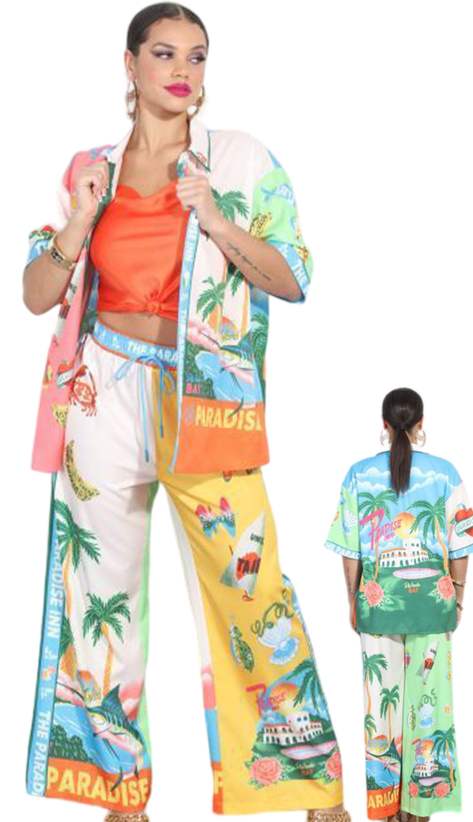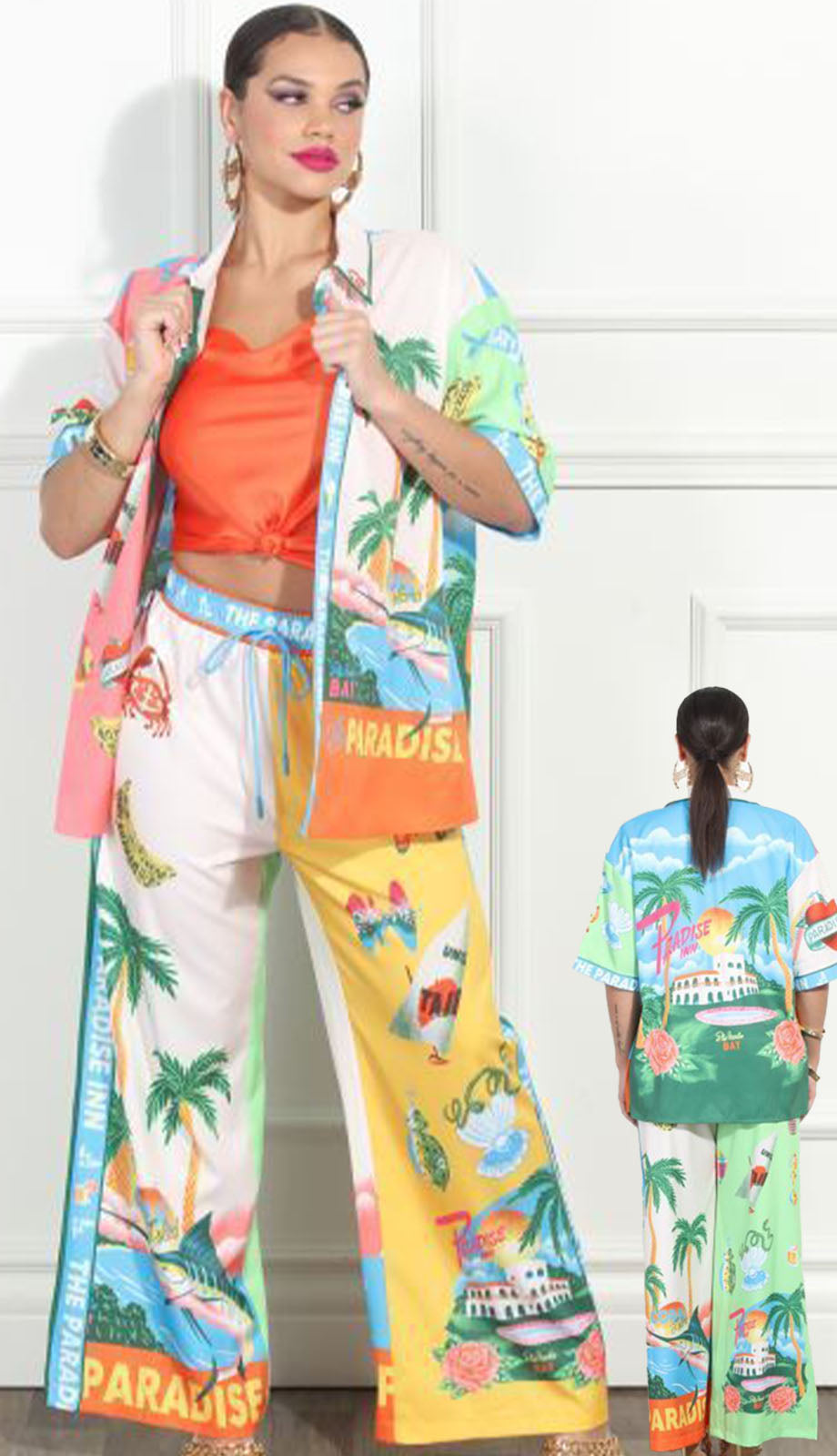 Immerse yourself in a tropical oasis with the Luxe Moda LM323 Outfit, a colorful ensemble that exudes summer vibes. This coordinated set includes a breezy jacket, a chic top, and wide-leg pants, all adorned with a vibrant print featuring palm trees, beach scenes, and floral motifs. The lightweight fabric ensures you stay comfortable whether you're strolling on the beach or dancing at a sunset soiree.