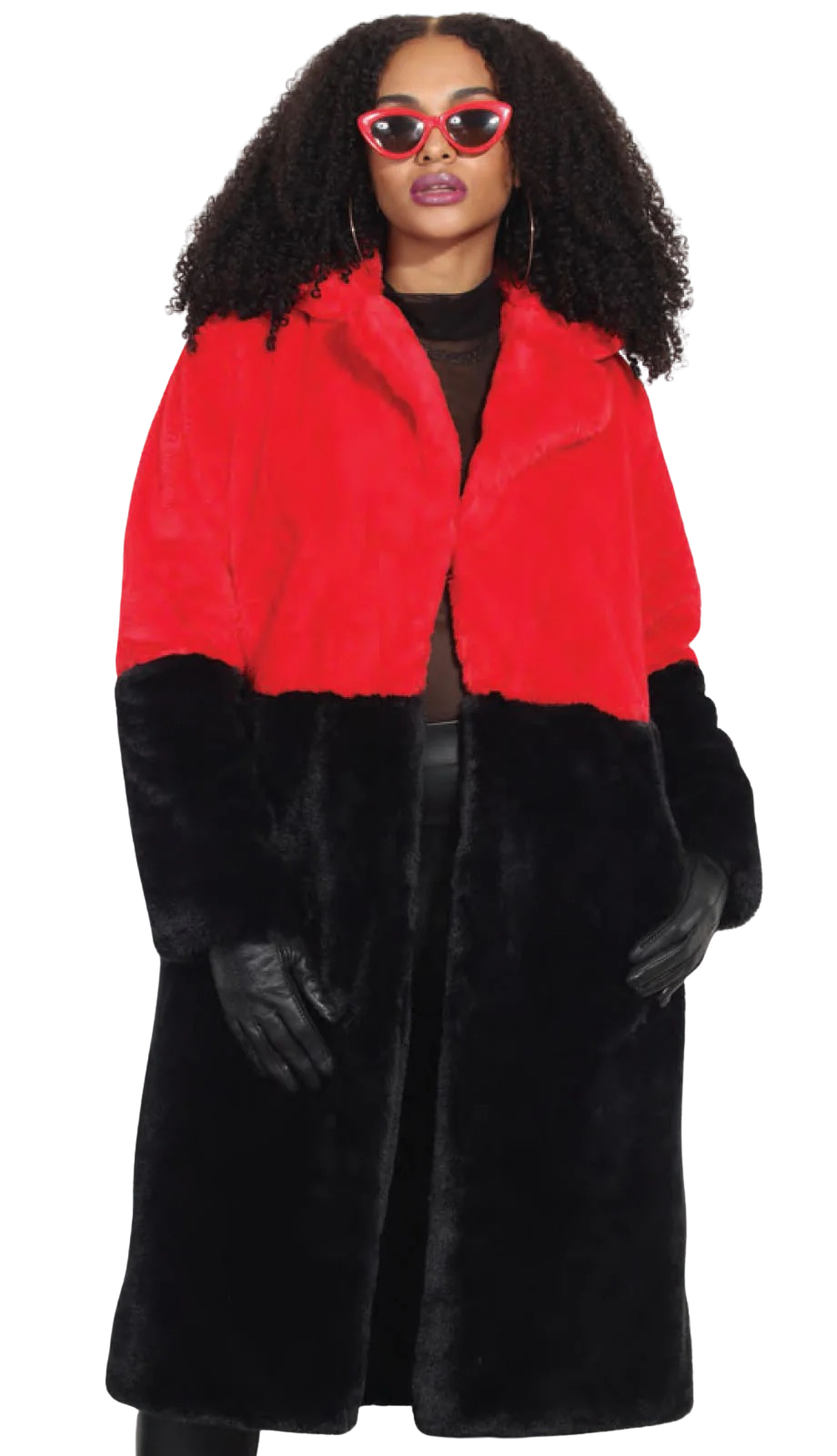 Introducing the Luxe Moda LM343 Outfit, a stunning ensemble that epitomizes both modern chic and timeless glamour. This eye-catching piece features a striking contrast between a vivid red and classic black color that's bound to turn heads at any event. Made with opulent faux fur, not only does it promise style, but it also ensures warmth and comfort in cooler conditions.