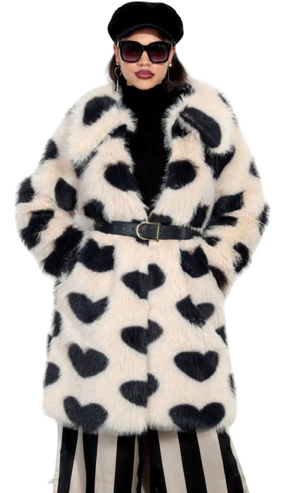 Underneath the statement coat lies a streamlined turtleneck sweater in classic black, perfect for creating a sleek silhouette. The included belt cinches at the waist, offering a flattering and customizable fit, ensuring a look that's both cozy and couture. Paired with bold and eye-catching striped pants, this outfit creates a harmonious blend of patterns that's both daring and sophisticated.