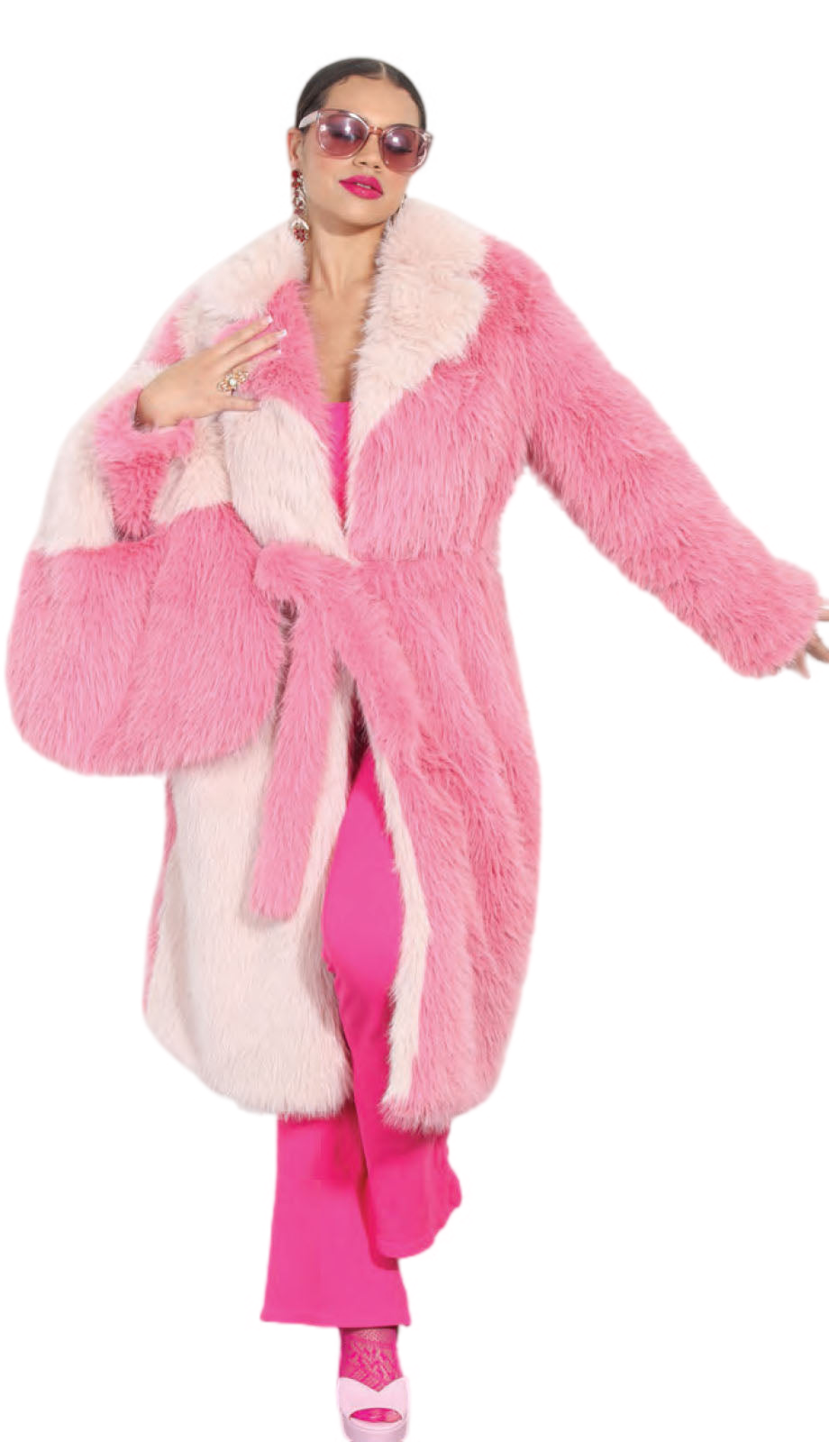 Introducing the Luxe Moda LM349 Outfit, a statement ensemble that combines bold style with the utmost elegance. The centerpiece of this outfit is the stunning faux fur coat, drenched in a playful pink hue that demands attention. This coat doesn't just stand out in terms of color; its luxurious texture adds a layer of sophistication and comfort, ensuring you look chic while staying warm.