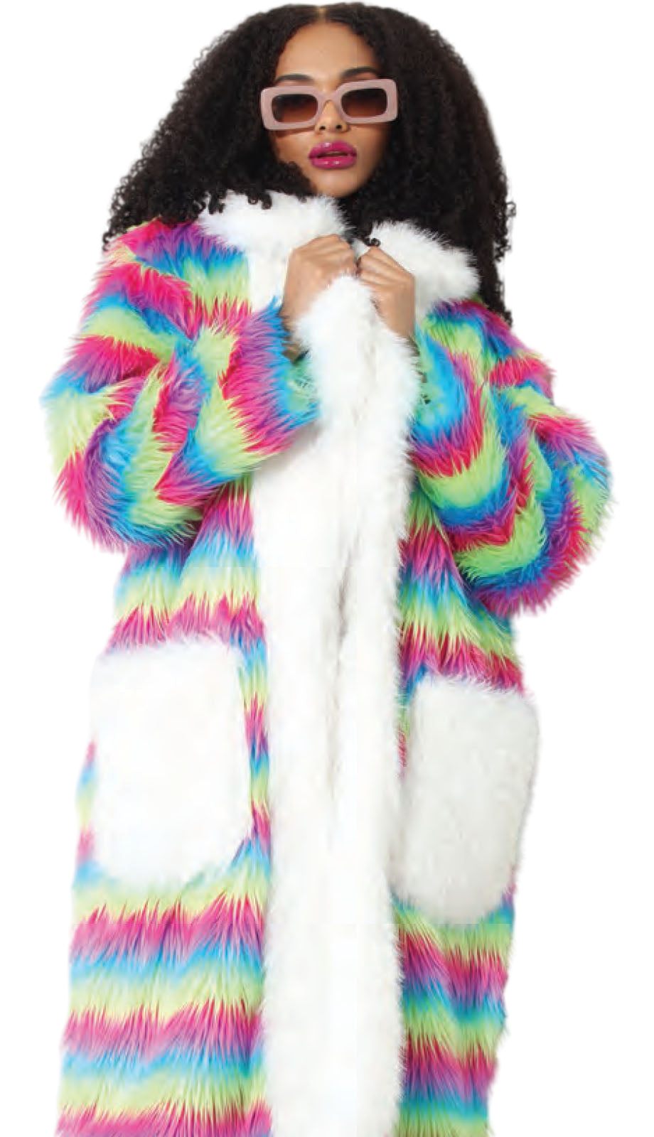 Discover the epitome of luxury and style with the Luxe Moda LM350 Outfit, a dazzling faux fur coat designed for those who dare to stand out. The spellbinding array of rainbow colors swirled into a playful, yet sophisticated pattern ensures that this coat is not just outerwear, but a statement of avant-garde fashion.