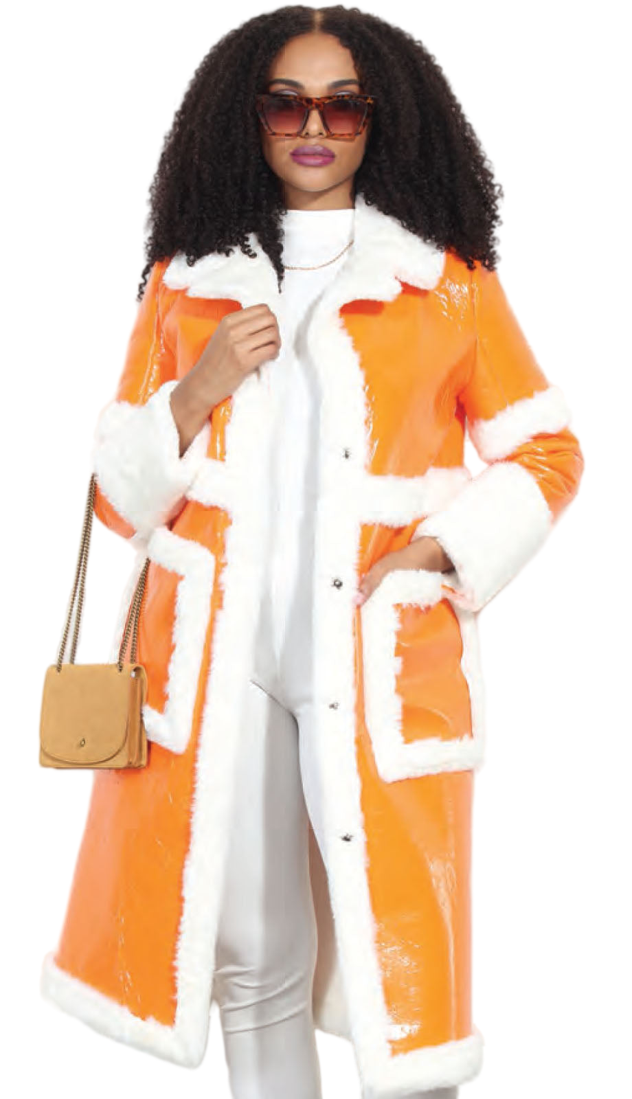 Introducing the Luxe Moda LM352-OWB Outfit, a stunning combination of bold style and cozy comfort. This striking ensemble features a vibrant orange coat paired with chic wide-leg white trousers, perfect for those looking to make a statement. The eye-catching orange hue is contrasted with plush white faux fur trim, adding a touch of elegance to the overall look.