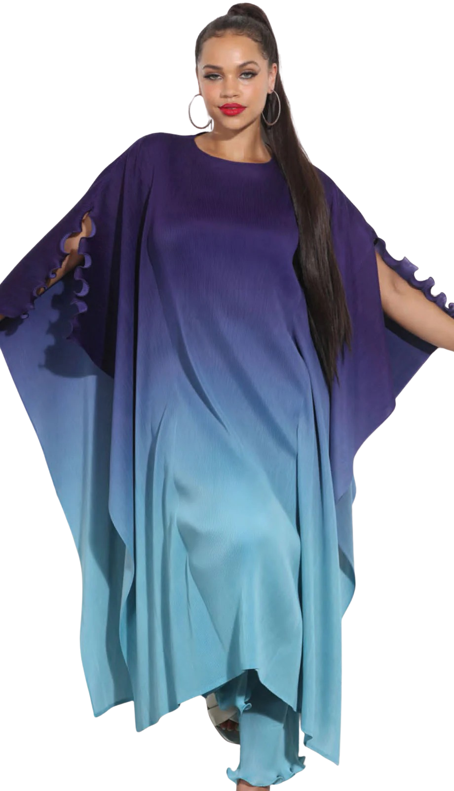 The stunning gradient color palette transitions smoothly from a deep, rich purple to a serene sky blue, creating a captivating visual effect that is sure to turn heads. The attached sleeves are nothing short of a design masterpiece, with eye-catching cut-out details and ties that add an artistic touch to the ensemble.