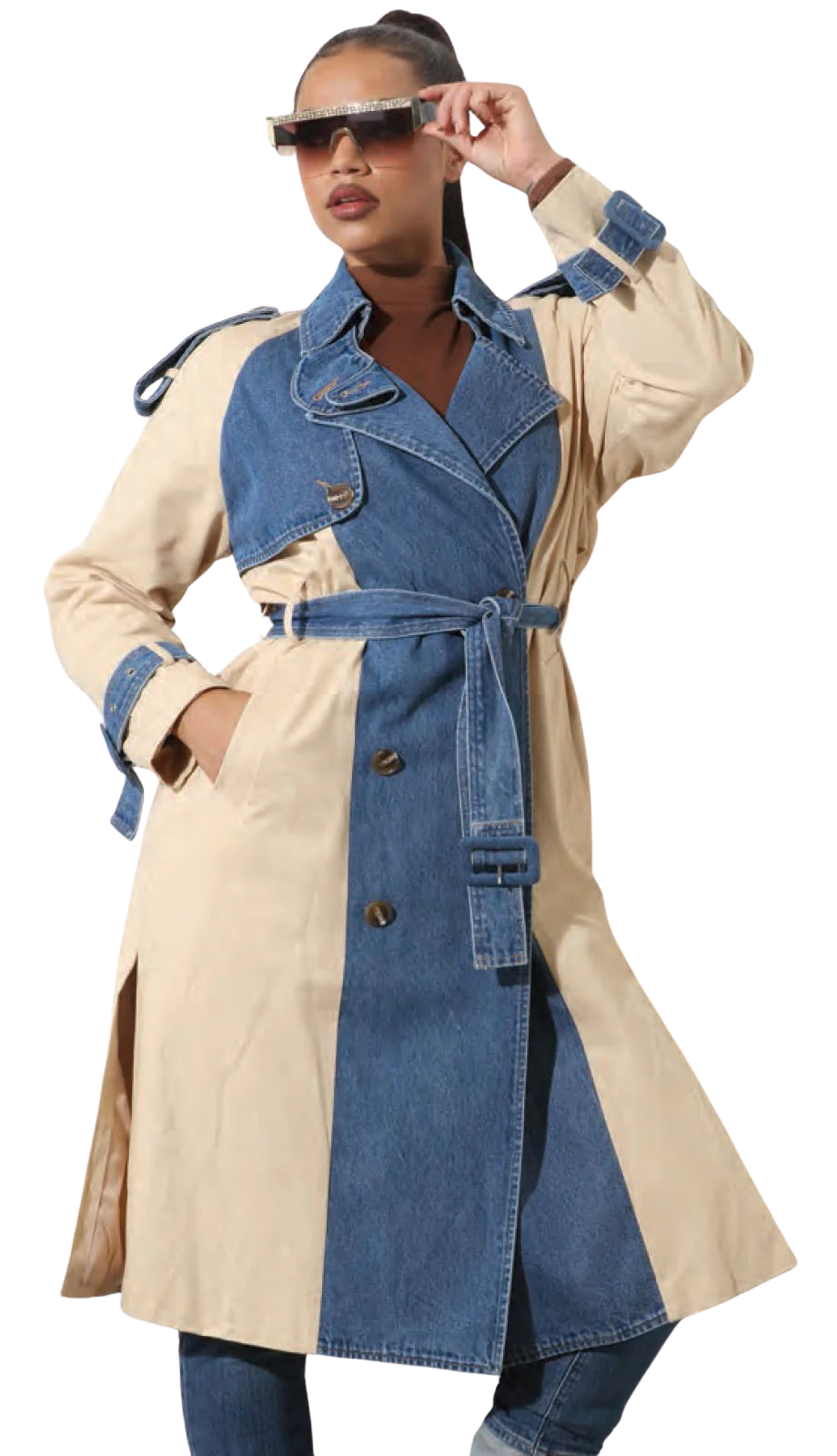 Introducing the Luxe Moda LM367 Outfit â a fashion-forward garment that creatively blends the iconic trench coat with the timeless appeal of denim. This innovative piece is a testament to modern style, offering a fresh take on classic wardrobe staples. The outfit is thoughtfully designed with elements of a traditional trench coat, such as the adjustable waist belt and button-down front, complemented by the robust texture of denim panels.