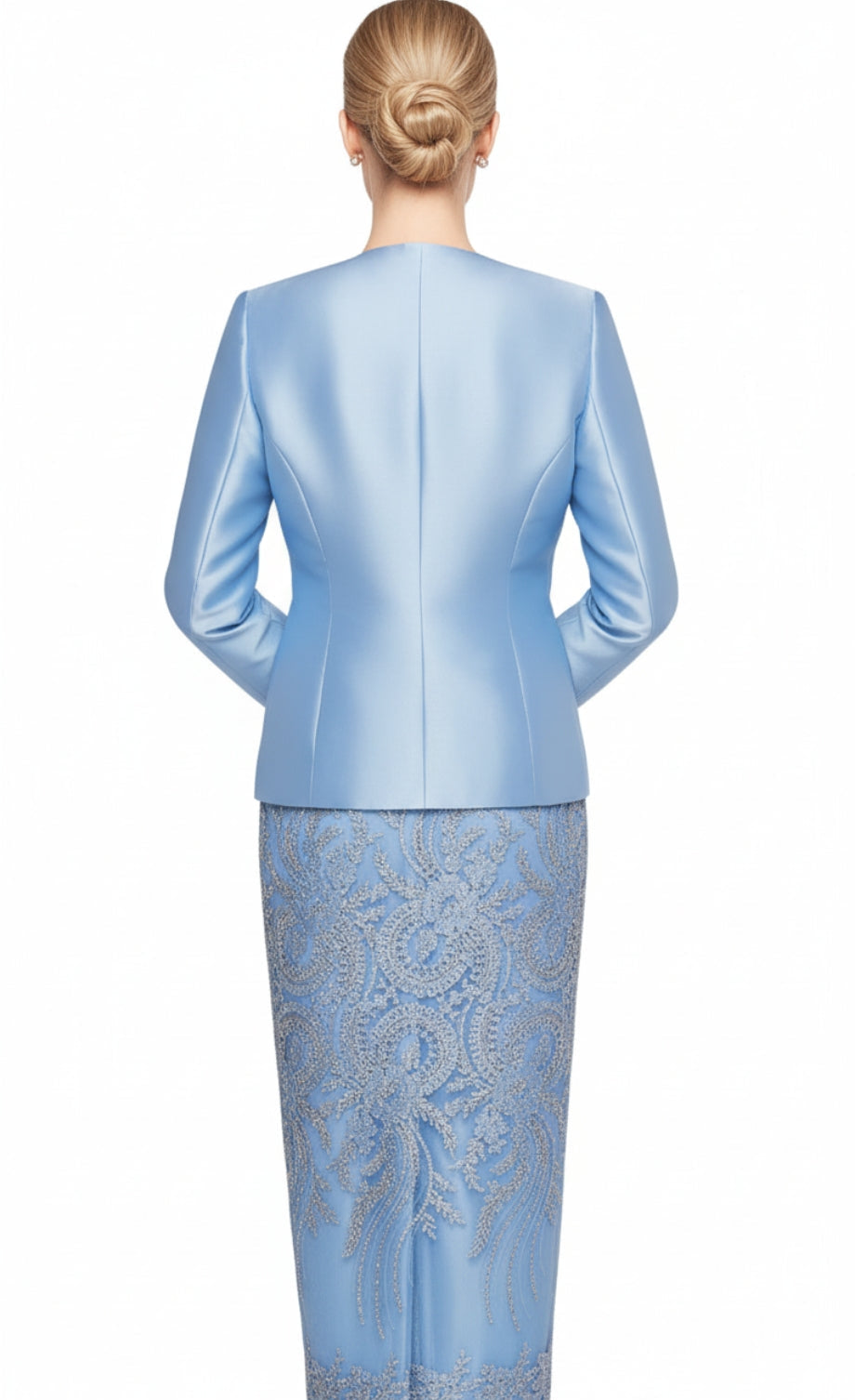 The Nina Massini 2470-SKY-CO is a stunning two-piece outfit that seamlessly blends elegance and sophistication. This exquisite ensemble features a luxurious light blue satin jacket paired with a beautifully crafted dress adorned with intricate silver embroidery, making it perfect for formal occasions such as weddings, gala events or evening parties.