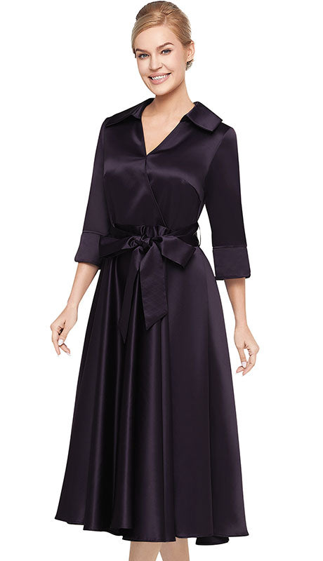 A standout feature is the adjustable waist, cinched by a charming satin sash that can be tied to your comfort, ensuring a customized fit that accentuates the waistline. Whether you're attending a morning service or an afternoon luncheon, the Nina Nischelle 2980S-PLUM Ladies Church Dress stands as a testament to the beauty in modesty, comfort, and style.