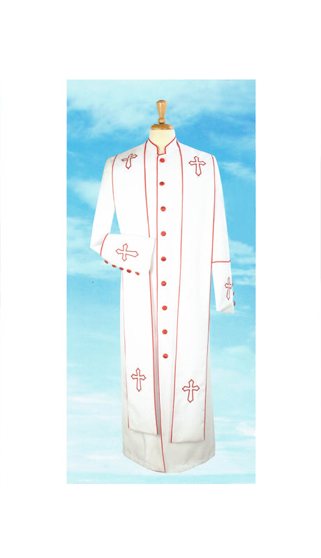 Introducing the Sapphire Collection Men's Church Robe, a garment that epitomizes reverence and grace. This robe, designed for those special ceremonies and services, strikes a perfect balance between tradition and style. The classic white color seamlessly blends with striking red accents, offering an attire that is both eye-catching and modest.