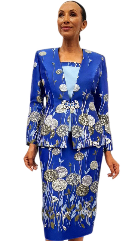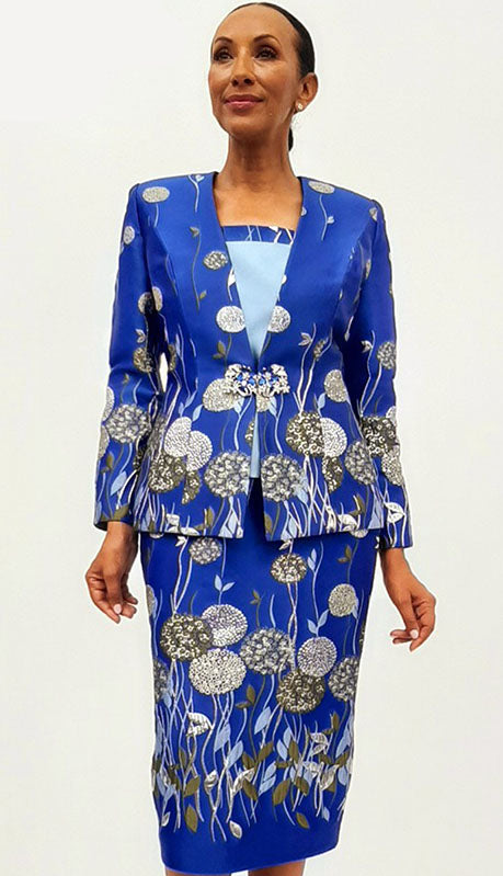 Step into a world of timeless elegance with the 4104 Serafina Church Suit. Designed with the sophisticated woman in mind, this stunning suit set boasts a luscious cobalt blue base, adorned with an exquisite silver floral print that exudes grace and refinement. The tailored jacket with its structured silhouette and delicate buttons creates a poised look, perfect for any formal affair.