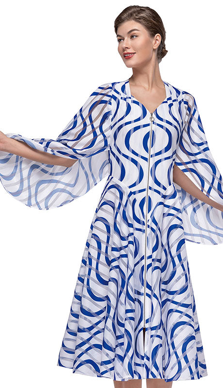 The pattern of the Serafina 6189-WWR Church Dress is a true testament to its beauty, featuring a compelling blue and white geometric print that mesmerizes and delights. The bell sleeves add an extra layer of elegance, infusing a sense of fluidity and movement to your gestures. Not just a feast for the eyes, the dress is crafted from lightweight fabric, which promises breathability and ease, allowing for full participation in the day's activities without discomfort.