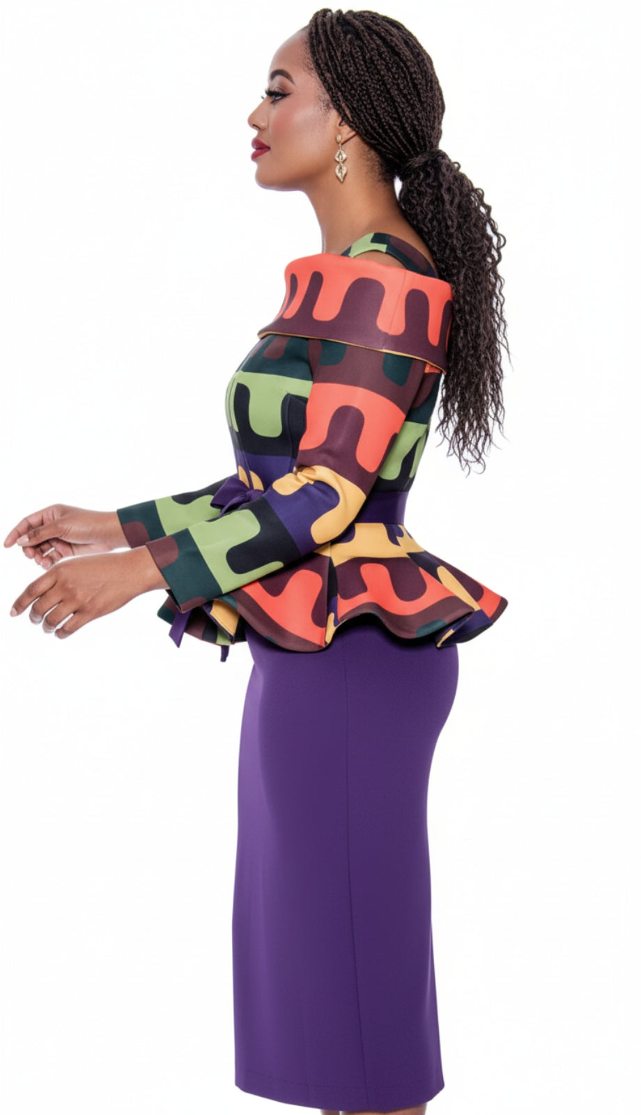 Made with a high-quality fabric blend, the church suit offers an impeccable fit and enduring comfort through prolonged wear. The vibrantly colored off-shoulder top features a distinctive pattern bound to turn heads and cement your status as a trendsetter. The accompanying belted waist accentuates your natural curves, while the lively flounce around the neckline adds an extra touch of flair.