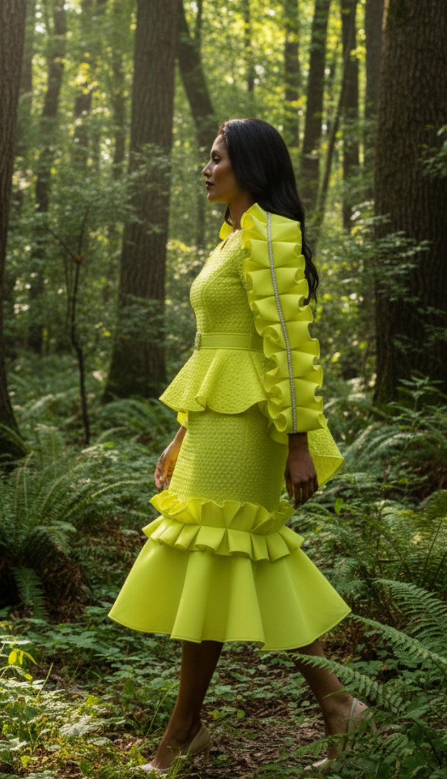 Attention to detail is evident in the stunning ruffle accents that adorn the sleeves and skirt, adding a dynamic and feminine charm to the ensemble. These elements are thoughtfully crafted to create a harmonious flow, making a statement without overwhelming the design. The suit is further elevated with a dazzling crystal embellished belt, which accentuates the waistline and infuses the outfit with an air of opulence.
