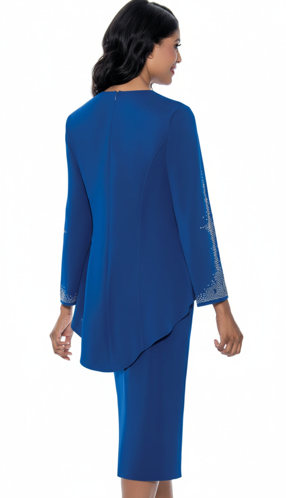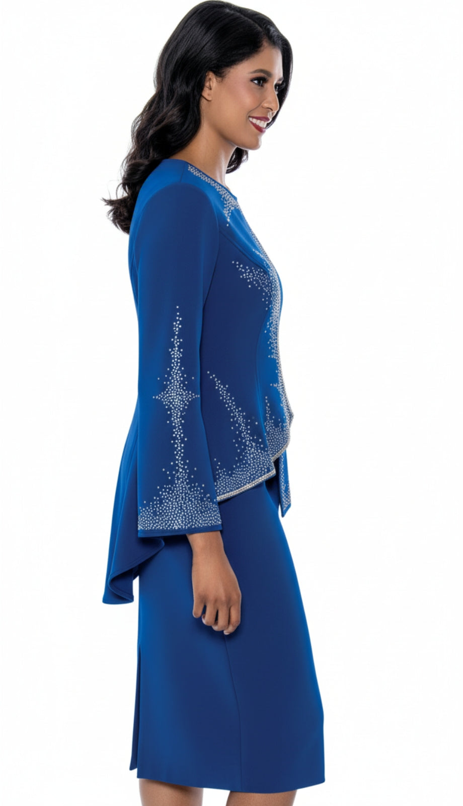 The jacket's three-quarter bell sleeves offer a modern twist to the classic attire, providing ample arm coverage while keeping the design fresh and on-trend. Completing the look is a sleek skirt with a hidden back zipper, designed to hug your curves in just the right places and falling to a modest length. Whether attending a church service, a wedding or a special event, the Stellar Looks SL600202-RYL Designer Church Suit is sure to make a statement of elegance and refined taste.