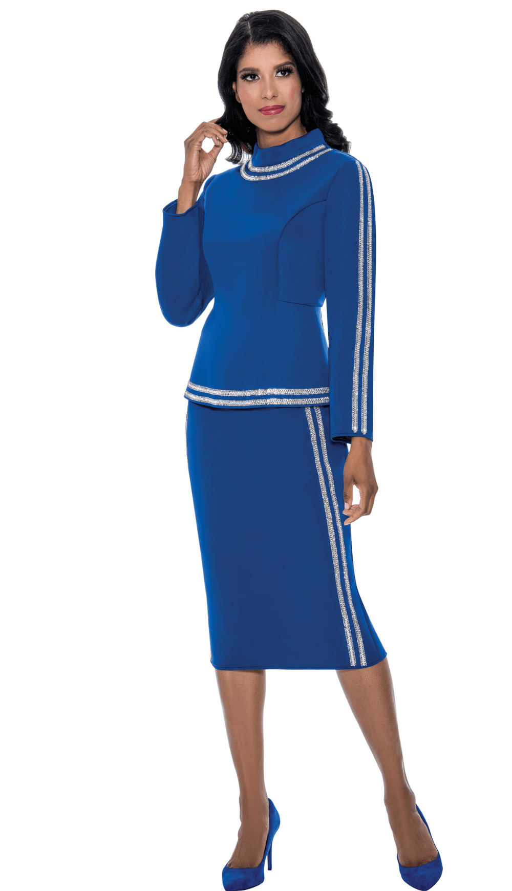 The suit features an exquisite trim detailing along the neckline, cuffs, and down the sides of the skirt, adding a touch of glamour without being ostentatious. Its thoughtful knee-length cut is conservatively stylish, ideal for a variety of formal occasions such as church services, weddings, or corporate events.