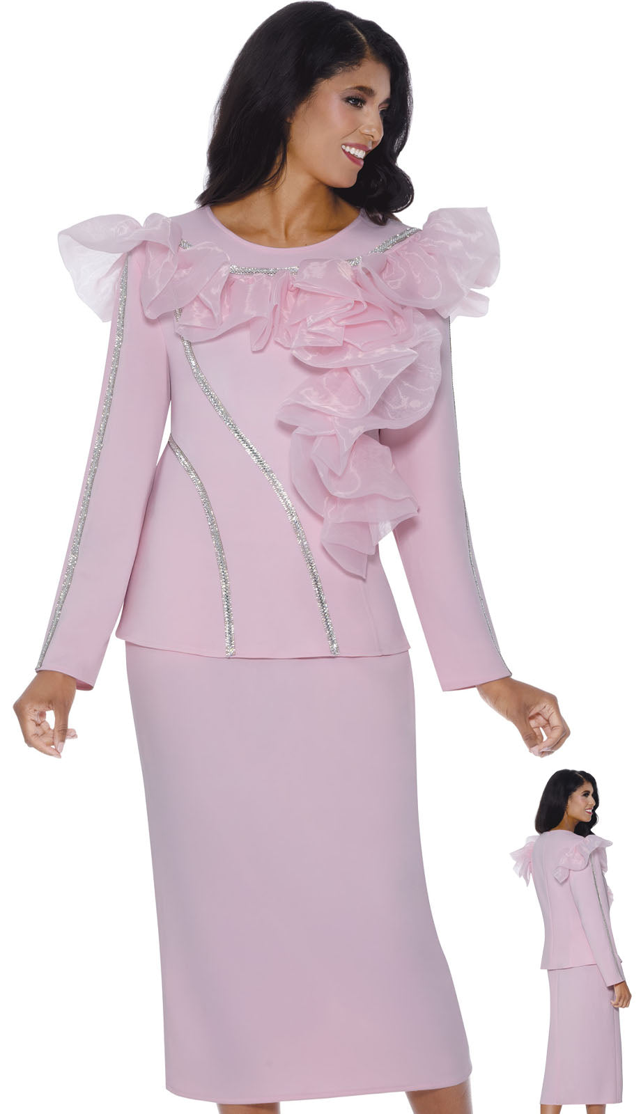 2pc High Quality Scuba Fabric Jacket And Skirt With Elegant Organza Ruffles From Shoulder To ShoulderFeatures Rhinestone Trim On Jacket And A Solid Color Skirt With Side PocketGreat Option for Sunday Church Or A Formal EventThis Ladies Church Suit is Fully LinedOutfit for Churchgoing Ladies