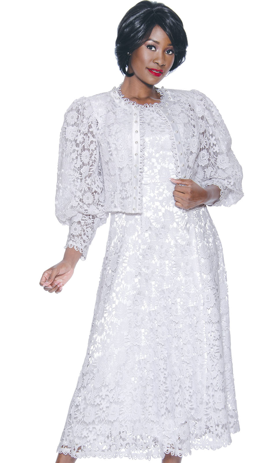 The suit's centerpiece is the stunning white lace that covers each piece, offering a delicate, floral texture that exudes grace and femininity. The intricate lace pattern ensures that you'll stand out in any crowd with an air of refinement. Its pristine white hue makes it a versatile choice for a variety of formal occasions, from church services to weddings, ensuring you'll look perfectly put-together no matter the event.