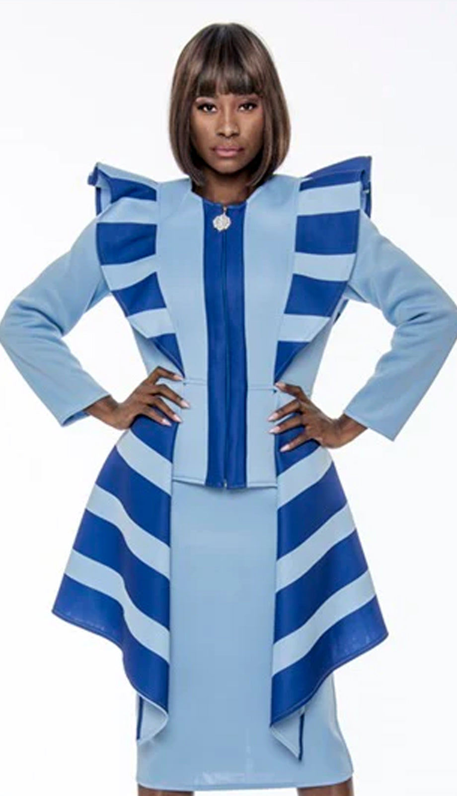 One of the standout elements of this attire is the stylish jacket with eye-catching ruffles that add an element of drama while remaining elegant. Paired with a sleek pencil skirt, the ensemble is perfect for both professional settings and formal occasions. The zip-front closure allows for effortless wear, ensuring you can transition from day to night with ease.