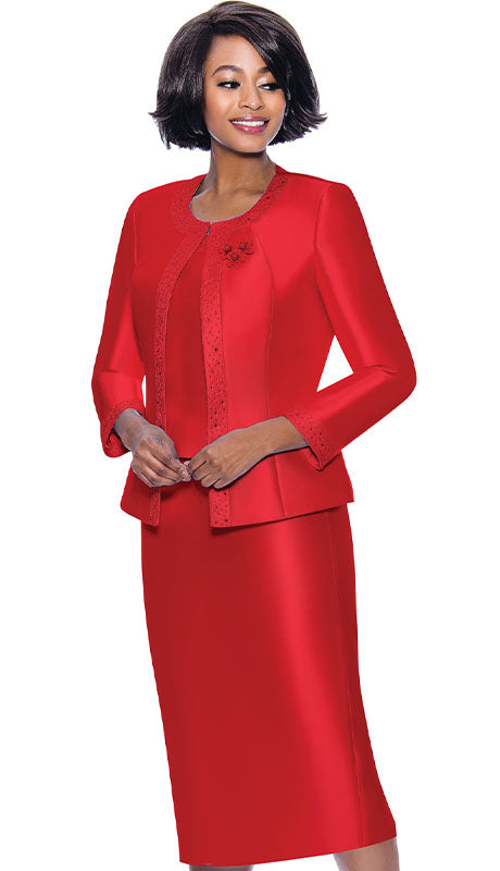 Introducing our Terramina 7637-RED Church Suit, a sophisticated ensemble that's sure to turn heads. This elegant two-piece suit represents a perfect combination of style and modesty, making it an ideal choice for church, work events, or any formal occasion. The vibrant red color exudes confidence and poise, ensuring you stand out in the most graceful way. The knee-length skirt is designed to flatter a variety of body types while offering the wearer a comfortable fit for all-day wear.