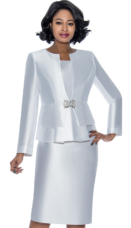 Attention to detail is evident in the ornate brooch that adorns the jacket, adding a touch of glamour without overpowering the suit's understated charm. This thoughtful addition eliminates the need for excessive accessories, allowing the wearer to shine in her individuality. While the hats are sold separately, this suit stands as a complete ensemble that exudes class on its own. Whether gracing the pews on a Sunday morning or attending a formal daytime event, the Terramina 7990-WHT Designer Church Suit is an impeccable choice that is sure to turn heads and leave a lasting impression.